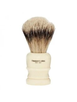 Brocha de Afeitar Truefitt & Hill, colección Wellington, fabricada con pelo de Tejón «Super Badger». Mango color marfil veteado con el logo de la marca grabado a mano. El pelo se selecciona manualmente para confeccionar un nudo denso y firme pero muy suave, exfolia y ayuda a elevar el bello sin irritar, para conseguir un acabado perfecto.