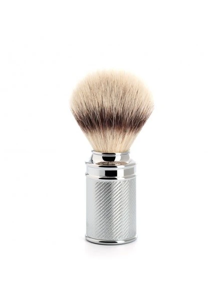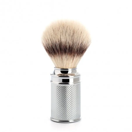 Brocha de Afeitar Mühle Fibra «Punta Plata». Esta brocha de afeitar debe su nombre al tipo de materiales con los que se fabrica: pelo sintético de fibra desarrollado exclusivamente por Mühle. Este mantiene una semejanza extraordinaria con el pelo natural del tejón “Punta Plata” tanto por su color como por su increíble suavidad.