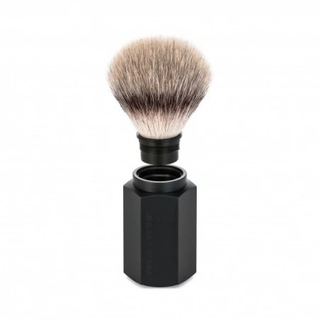Su mango de aluminio anodizado en color negro combina a la perfección por el nudo recambiable fabricado con las fibras punta plata de Mühle. Estas fibras sintéticas de alta calidad, primicia mundial de Mühle, tienen características muy similares al pelo de tejón, pero con grandes ventajas. Es muy suave en las puntas, pero más estable que el pelo natural en la sección media del nudo. Además, secan más rápidamente y son más fáciles de usar, ya que producen una espuma cremosa y espesa con una pequeña cantidad de jabón.