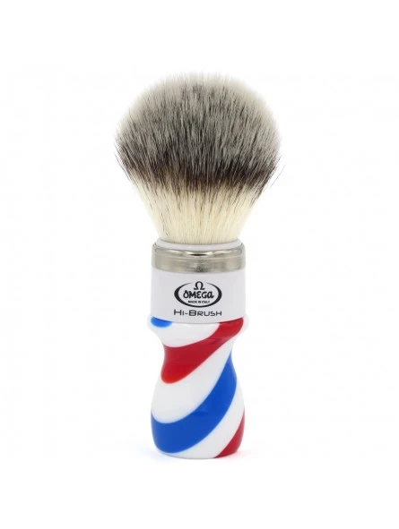 Brocha de Afeitar Omega 6807 Barber Pole Fibra Sintética «Hi Brush». Inspirada en el poste clásico de Barbería, de marcado acento “Vintage”. Una imprescindible para los amantes del afeitado. Hi Brush es la nueva fibra sintética desarrolladla por Omega para revolucionar el mercado de la brochas veganas. Mejoran el rendimiento liberando la cantidad adecuada de jabón en cada raspado y crea la espuma de forma rápida y efectiva mejorando al cerdo y el tejón. Su tratamiento en puntas la convierte en una brocha suave y duradera, fácil de limpiar y mantener, más higiénica que el pelo natural.