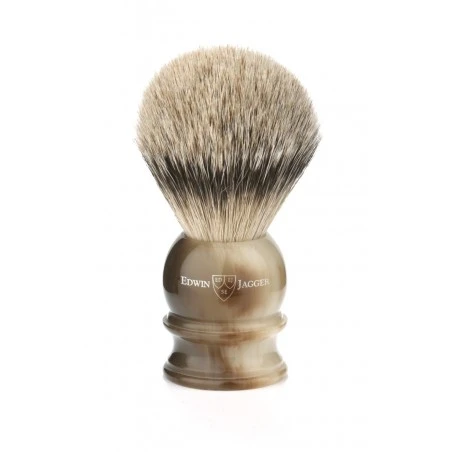 Brocha de afeitar Edwin Jagger Tejón » Punta Plata» con mango imitación cuerno natural, fabricada a mano en Sheffield, Inglaterra, con materiales seleccionados.
