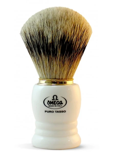 Brocha de Afeitar Omega 641 Tejón Punta Plata con mango acrílico blanco y virola dorada.