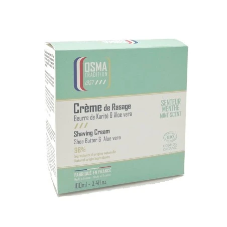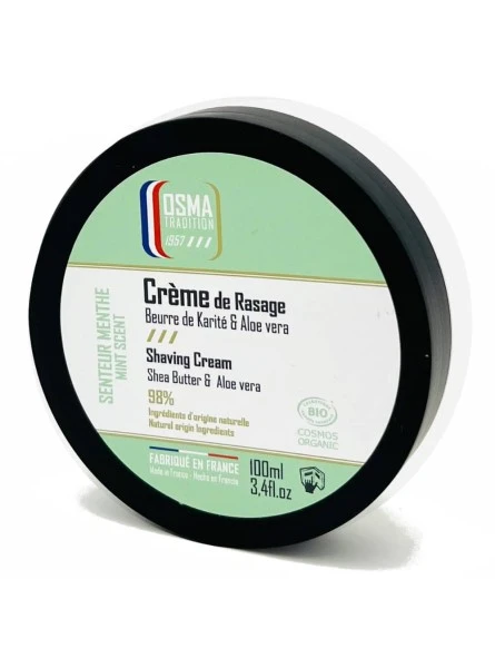 Crema de Afeitar Manteca de Karité & Aloe Vera Menta Osma 100ml. Formulada con un 98% de ingredientes de origen natural, nuestra crema de afeitar está enriquecida con manteca de karité y aloe vera. Una textura cremosa de fácil aplicación.