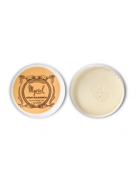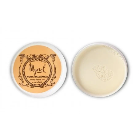 Crema de afeitar Agua Balsámica Myrsol 150ml. Crema de afeitar enriquecida con lanolina, especialmente creada para el afeitado con brocha. Ablanda el vello facial mejorando el deslizamiento de la cuchilla. Su cremosa textura mórbida facilita la formación de una espesa y densa espuma que convierte el afeitado en un placer. Respeta el PH de la piel, protege e hidrata.