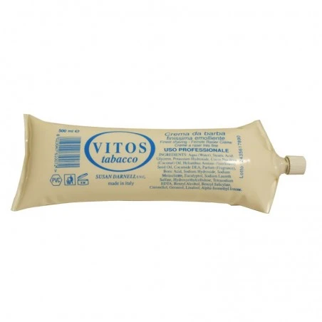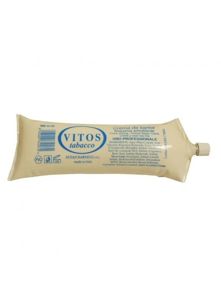 Crema de afeitar Vitos Profesional “TABACCO” 500ml. Vitos elabora está equilibrada crema de afeitar de alta calidad. Inspirada en las fórmulas de barbería tradicional, a base de eucalipto y lanolina. Consigue una generosa y deslizante espuma, que facilita el apurado y protege la piel.
