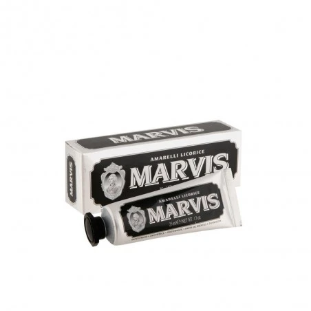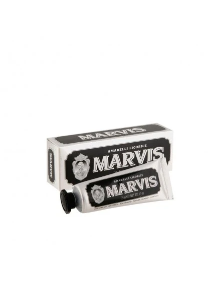 Dentífrico Marvis Amarelli Mint (Regaliz) 25 ml. El Placer del sabor en esta rica y cremosa pasta de dientes Marvis que ofrece una sensación de intenso sabor, elimina la placa y el sarro para una sonrisa blanca y brillante.