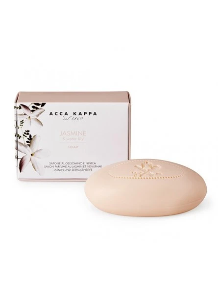 Jabón Jasmin & Water Lily Acca Kappa 150gr. Los jabones vegetales de Acca Kappa se elaboran con una pasta base obtenida de la saponificación de aceites vegetales puros. La pasta se procesa a través de un troquel donde las virutas se funden y se mezclan con la fragancia. Una ligera flor de jazmín blanco y pequeños nenúfares verdes suspendidos sobre el agua. Un sugerente acorde de delicados pétalos de flores que deja en el aire un aroma envolvente e hipnótico. El jazmín y el lirio de agua es una composición artística romántica típica de un paisaje impresionista, un símbolo de gracia y candor.