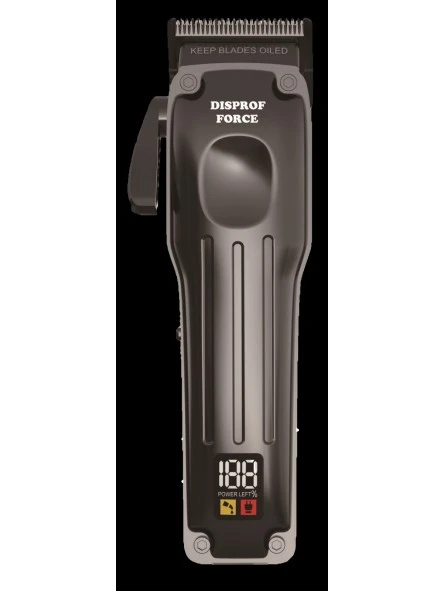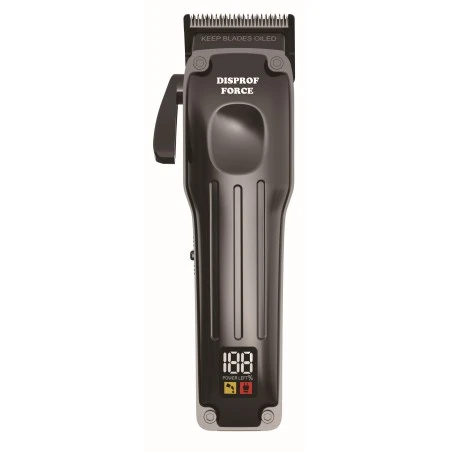 Máquina Cortar Pelo Profesional Clipper Force Disprof. Máquina de corte profesional Disprof FORCE Clipper con cuerpo metálico, cuchilla de acero inoxidable DLC, pantalla digital y autonomía de 3 horas. Incluye 6 peines metálicos.