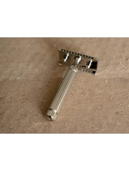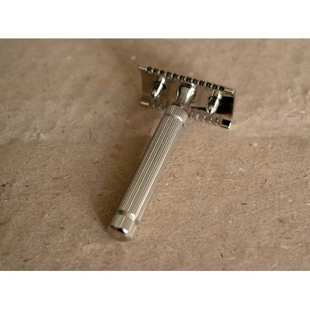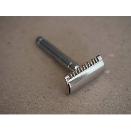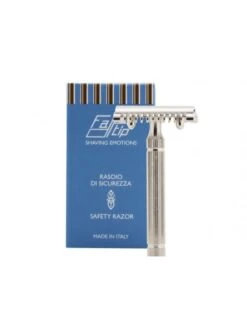 Maquinilla de afeitar clásica Fatip «Piccolo» (tamaño pequeño), con cabezal de «peine abierto». Mango corto antideslizante, niquelado.
