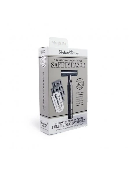 La Maquinilla Afeitar Clásica Rockwell 6C Gunmetal está hecha con zinc cromado con un vistoso brillo.