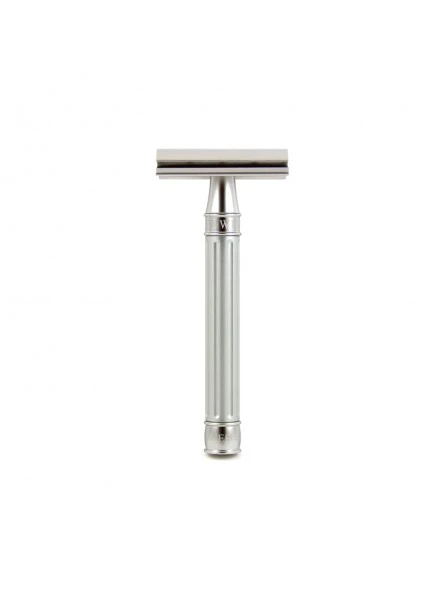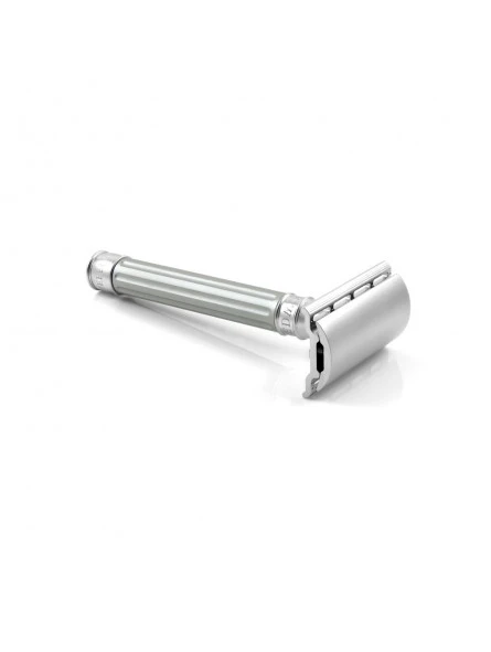 Su mango Grooved, ésta vez en color plateado, está hecho de aluminio anodizado de grado aeroespacial y ofrece un acabado llamativo y elegante. Al no estar fabricada entera con acero inoxidable, ésta maquinilla es más ligera. Su acabado estriado proporciona un agarre adicional.