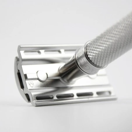 Su mango Knurled, también de acero inoxidable, está fabricado mediante un moleteado de diamante, lo que proporciona a la maquinilla un agarre extra, que te proporcionar a los mejores resultados.