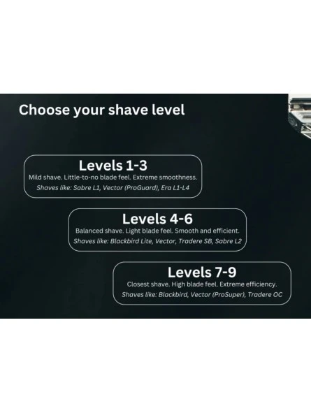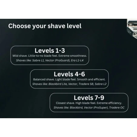 No hay límite para los niveles de afeitado de la Osprey. Nuestros indicadores de nueve niveles son un buen punto de partida, pero nunca está restringido a números enteros. Los niveles intermedios te ayudan a ajustar la Osprey exactamente al nivel adecuado para tu cara. Si el Nivel 5 es demasiado y el Nivel 4 es demasiado poco, pruebe el Nivel 4.5.