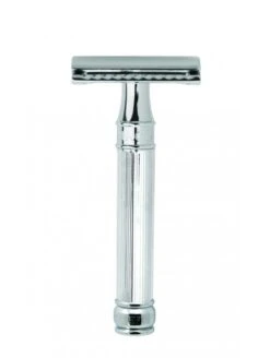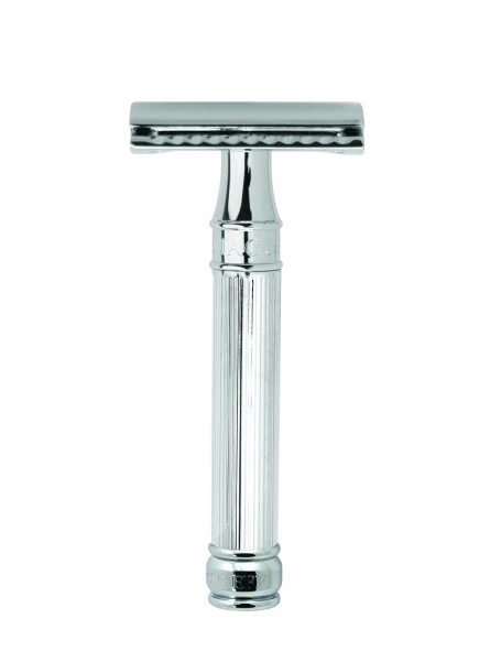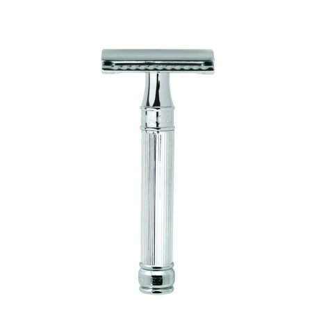 Maquinilla de afeitar Edwin Jagger DE89L Cromo Brillo. Mango muy ligero, está acabado en cromo-brillo, con un relieve alineado que mejora el agarre y evita el deslizamiento, en el cuello del mango se aprecia la impresión de la marca Edwin Jagger.