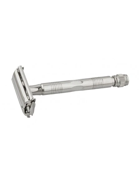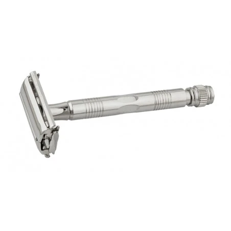 Maquinilla cláscia de afeitar Vie-long 95R, apertura mariposa para hoja intercambiable de doble filo, largo 11cm. Acabado cromo brillo.
