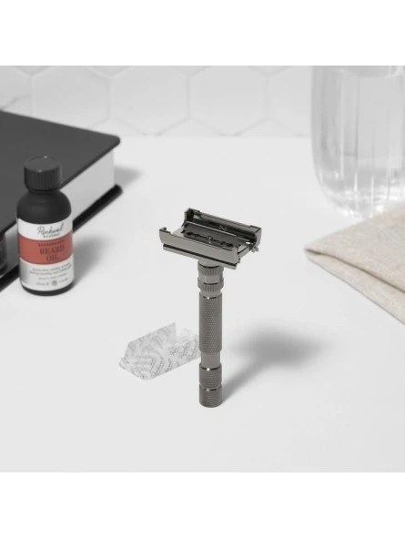 Maquinilla de Afeitar Model T2 Gun Metal Rockwell. Las mejoras que ofrecen este modelo es la fabricación con un mecanismo simple de giro para que la apertura sea seguro e intuitivo para la agilidad en la carga y descarga de la cuchilla.
