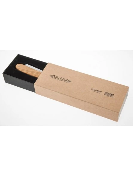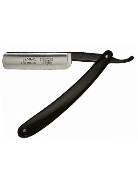 Navaja de afeitar Timor con hoja de 5/8” fabricada en acero de carbono con grabado. Fabricadas a mano siguiendo la tradición. Cacha plástico negra.