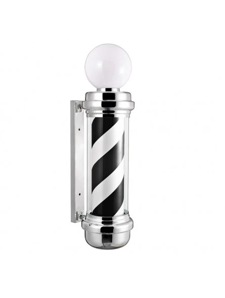 Polo Barbero Negro & Blanco con Esfera Epsilon. Fabricado con materiales resistentes de alta calidad, como su superficie cromada en color negro y el cilindro exterior transparente, con los colores negro y blanco, es acrílico y muy sólido. Además, el enganche a la pared es de acero inoxidable, asegurando la resistencia del producto en exteriores. Su lámpara LED aporta una luz de calidad y la esfera blanca superior también se ilumina.