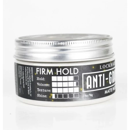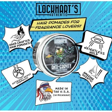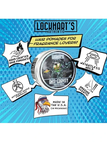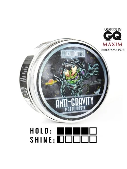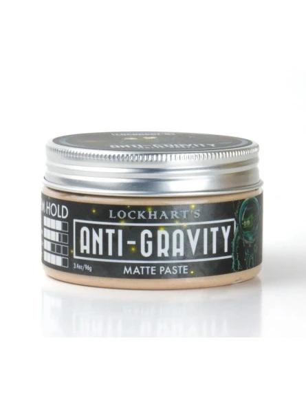 Pomada Anti-Gravity Lockhart’s 105g. Híbrido fijador del cabello: consistencia de una fibra ligera, fácil de aplicar como la pomada, fija como una pasta, y como la arcilla proporciona textura y volumen. Proporciona una fijación fuerte y un acabado realmente mate. Una fórmula única a base de agua y con bentonita y caolín, que aportan textura; con acrilatos, aportan fuerza y rigidez, y con aceites de coco, de pepino y de romero, con grandes beneficios.