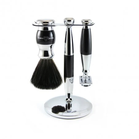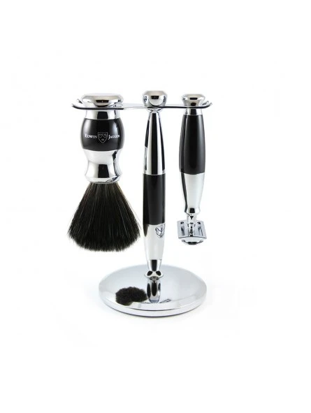 Set 3 Piezas Negro Maquinilla Clásica, Brocha de Afeitar Sintética & Soporte Edwin Jagger. Edwin Jagger nace en 1988 en Sheffield, Inglaterra, con el objetivo de diseñar y crear una variedad de accesorios de afeitado de alta calidad. La combinación de un diseño experto, la habilidad de los artesanos y la tecnología moderna hacen de Edwin Jagger un fabricante de los mejores accesorios de afeitado hechos a mano. Edwin Jagger presenta su nueva Diffusion Collection 36 Range, un conjunto de productos fabricados con una combinación de los mejores materiales, la última tecnología de mecanizado CNC, y un acabado y ensamblaje tradicionales hechos a mano. Su diseño elegante y contemporáneo en color plateado y negro, no dejará de sorprenderte.