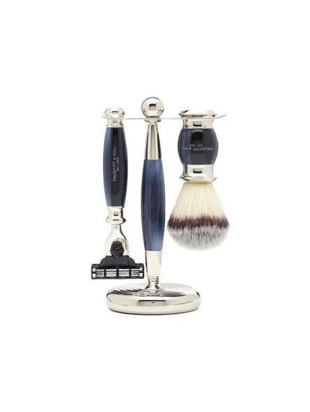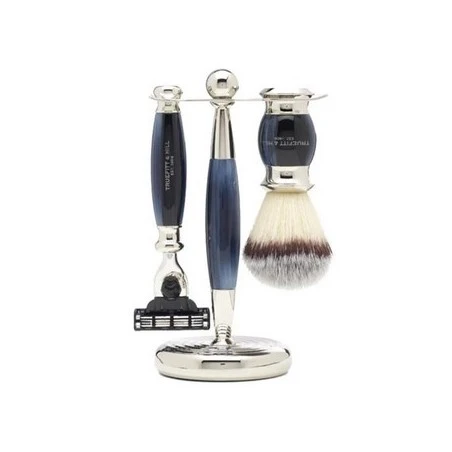 Set afeitado Edwardian Azul Brocha Tejón Sintética, Maquinilla Fusion & Soporte Truefitt & Hill. Set de afeitado elegante y sofisticado compuesto por una maquinilla, una brocha de afeitar y un soporte que permite tener ambas piezas bien dispuestas y ordenadas para lucirlas de forma elegante, para asegurar su correcto secado y para alargar su vida útil. Las tres piezas están fabricadas en resina de alta calidad con acabado cromado que simula el ópalo azul.