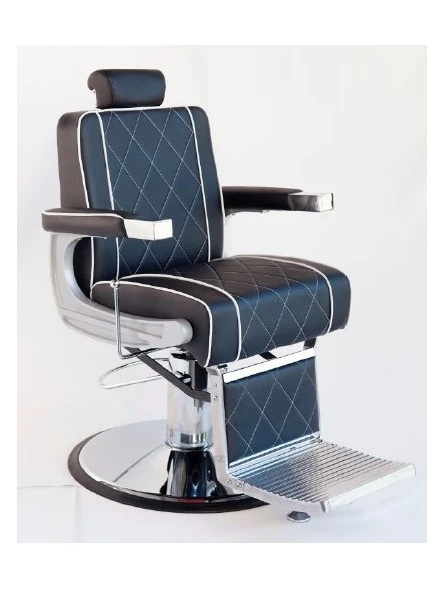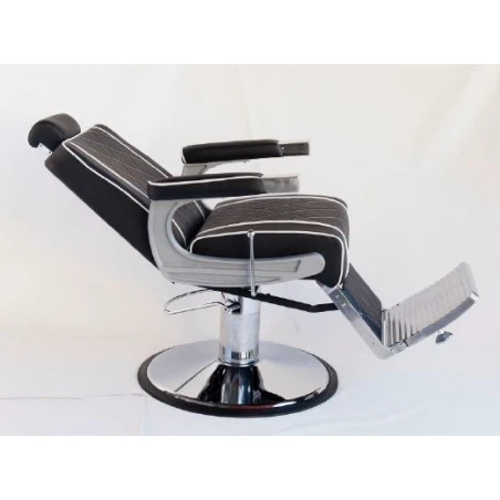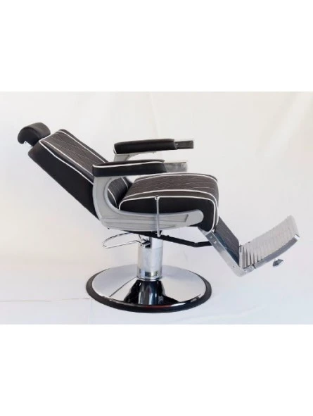 Sillón Barbero Negro. Sillón de barbero fabricado con materiales de alta calidad. Está dotado de una bomba hidráulica para regular la altura del asiento. Además el asiento es también reclinable y cuenta con un apoya cabezas y un reposapiés fijos. La espuma del respaldo y del asiento tiene un grosor ideal para asegurar que se adapte a cada cliente, haciéndolo sentir muy cómodo.