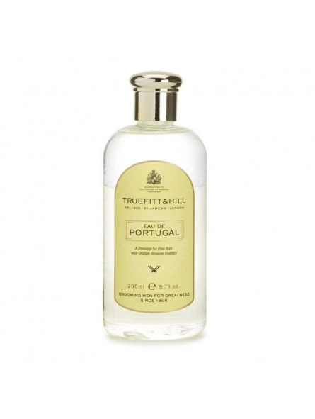 Truefitt & Hill Tónico Capilar Eau de Portugal 200ml Eau de Portugal es un apósito ligero para cabellos finos. Tiene una esencia de azahar fresca y sabrosa que tiene propiedades fortalecedoras y estimulantes y está diseñada para dar una fijación ligera. Adecuado para cabello corto a mediano.